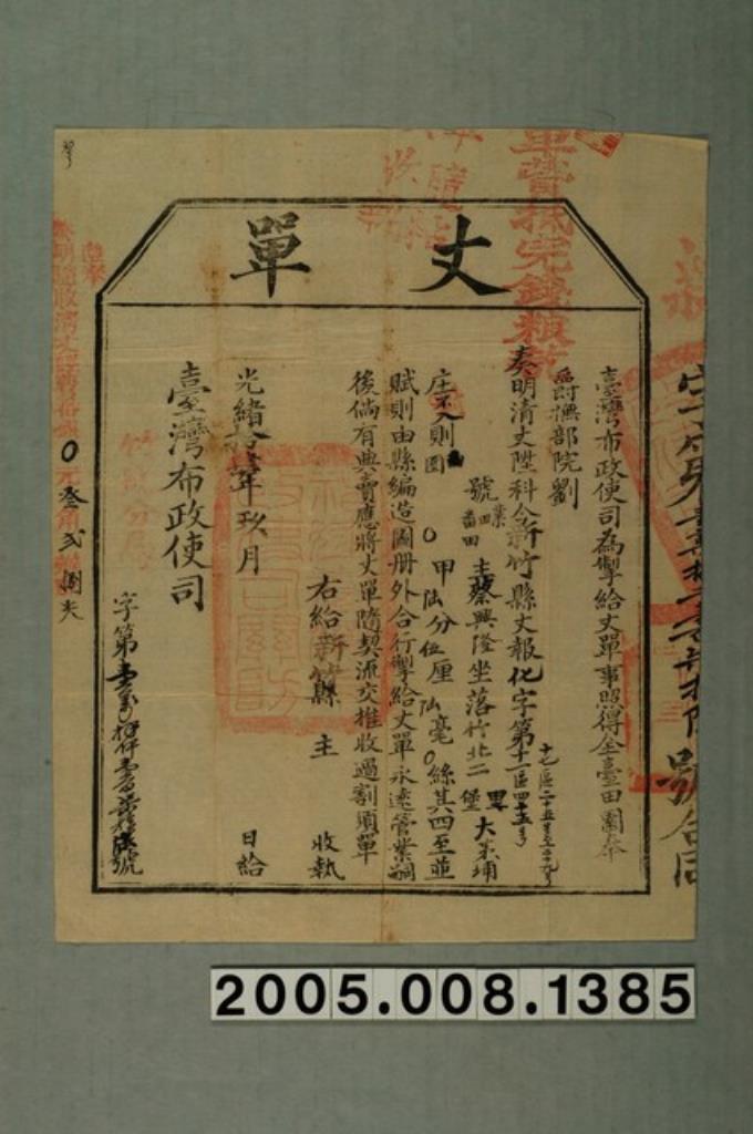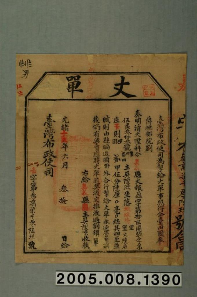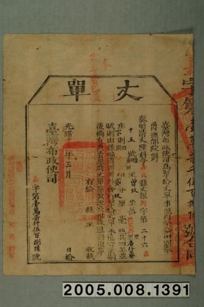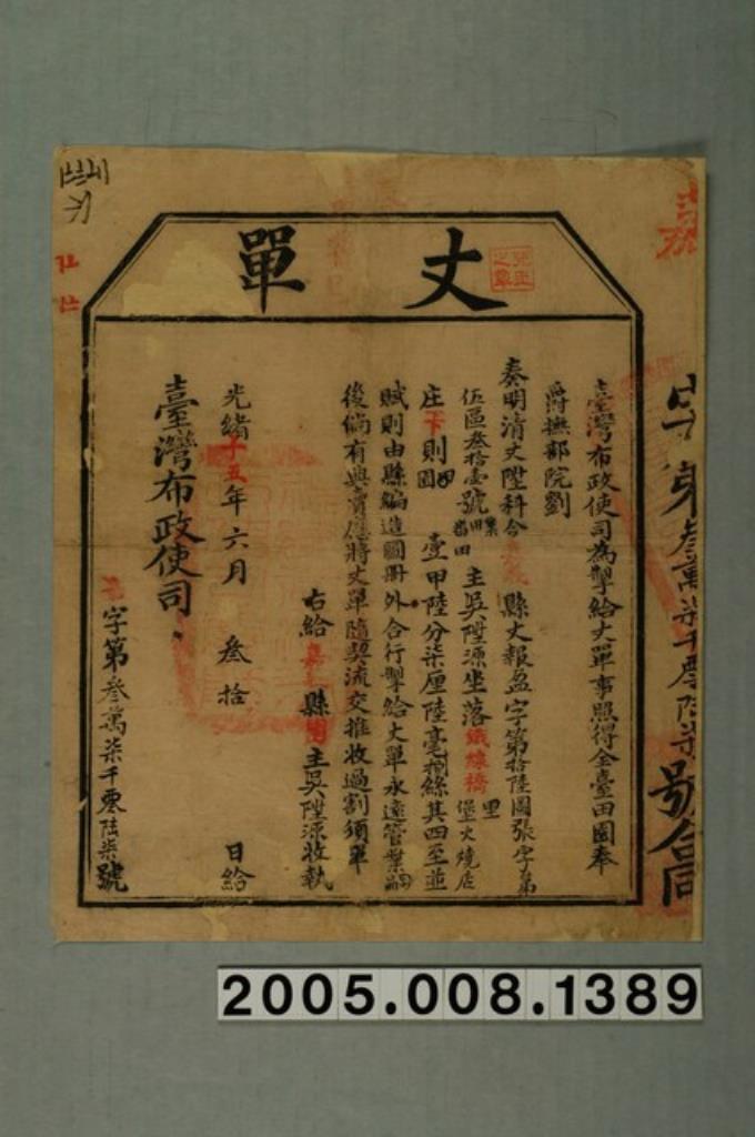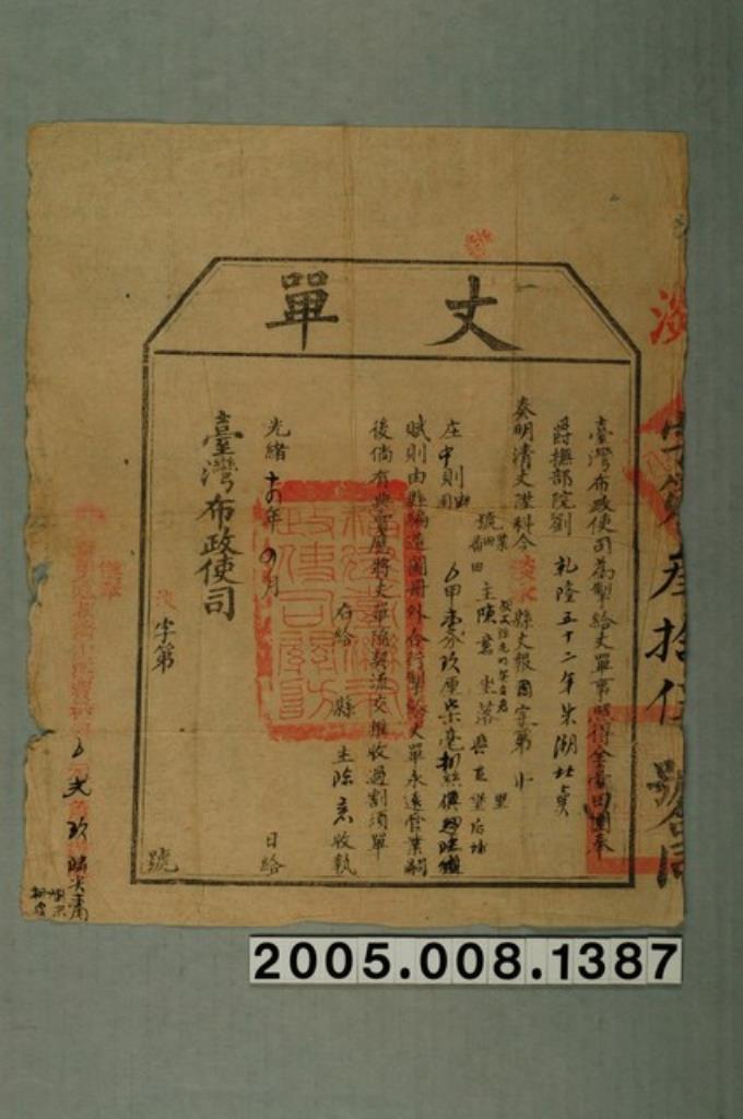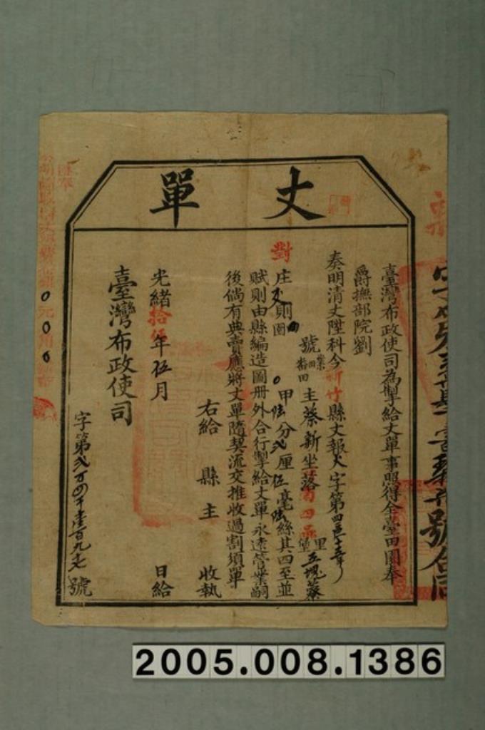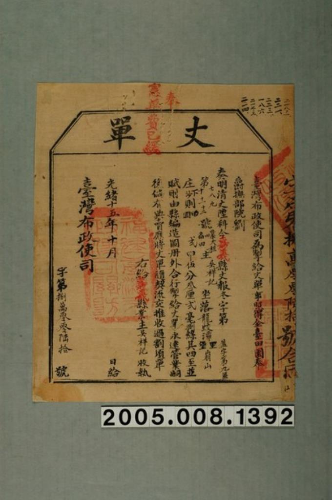 光緒15年臺灣布政使司給曾蚊丈單