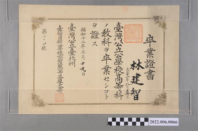 林建智昭和12年公立臺北州臺北市日新公學校卒業證書