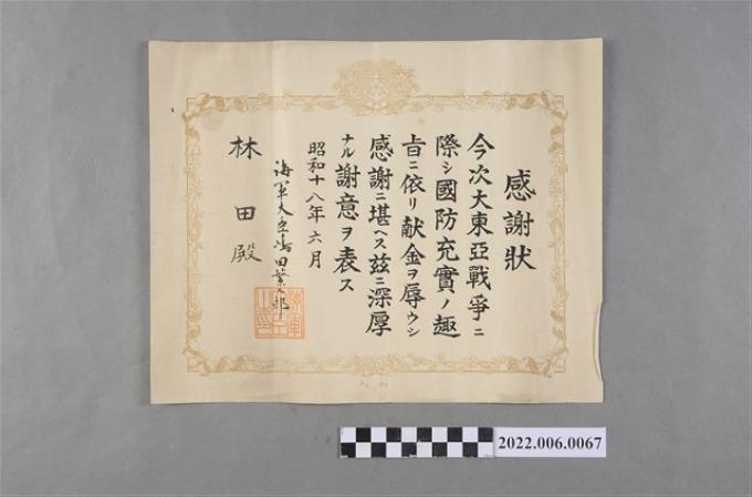 林田昭和18年國防捐獻感謝狀