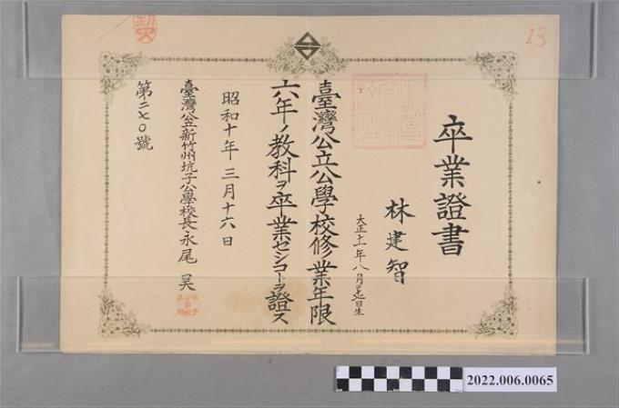 林建智昭和10年臺灣公立新竹州坑子公學校卒業證書