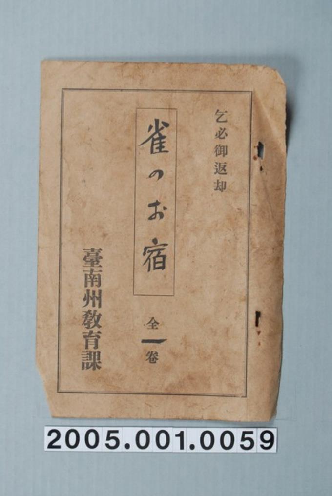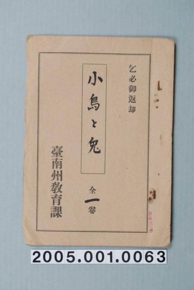臺南州教育課核發影片「小鳥與兔子」准演執照