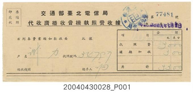 民國49年交通部臺北電信局發給謝力代收廣播收音機執照費收據第77481號