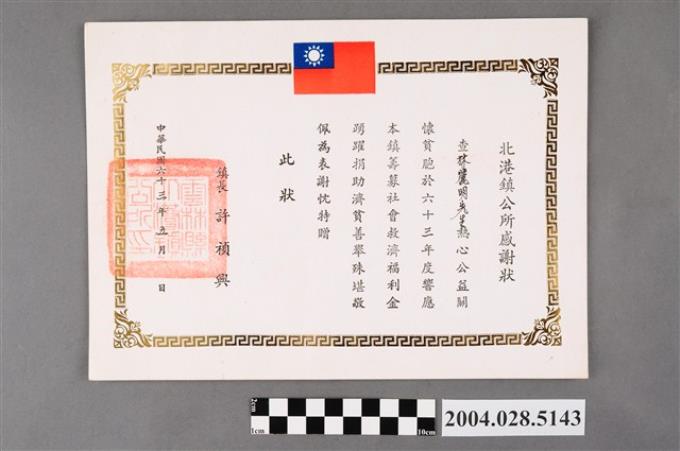 民國六十三年北港鎮公所頒予林麗明感謝狀