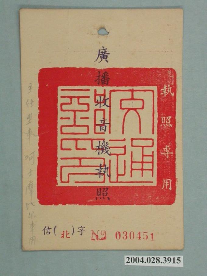 民國52年臺灣電信管理局發給徐鳳鳴廣播收音機執照信北字第013089號