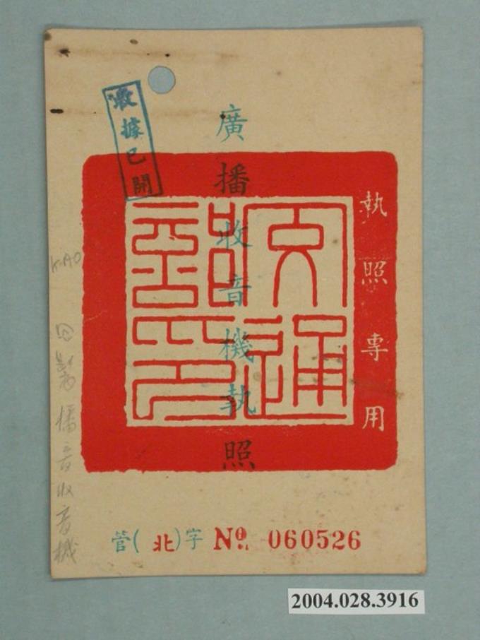 民國53年臺灣電信管理局發給交通處公路局汽車技術員工訓練中心廣播收音機執照管北字第060526號