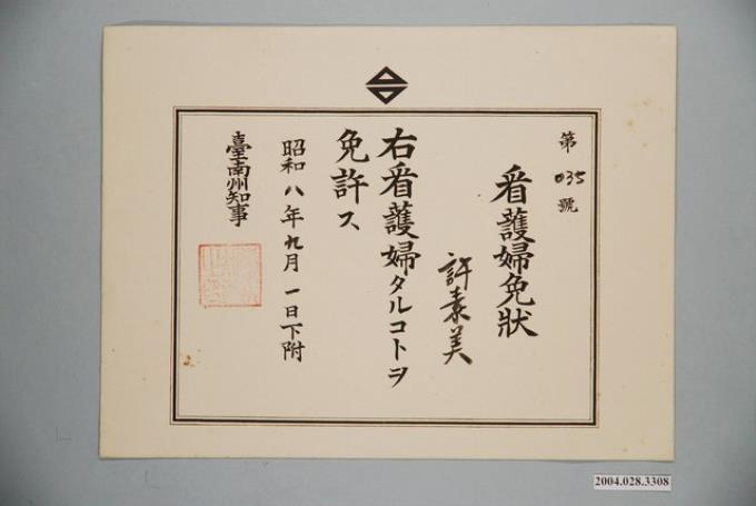 昭和8年許素美護理人員許可證