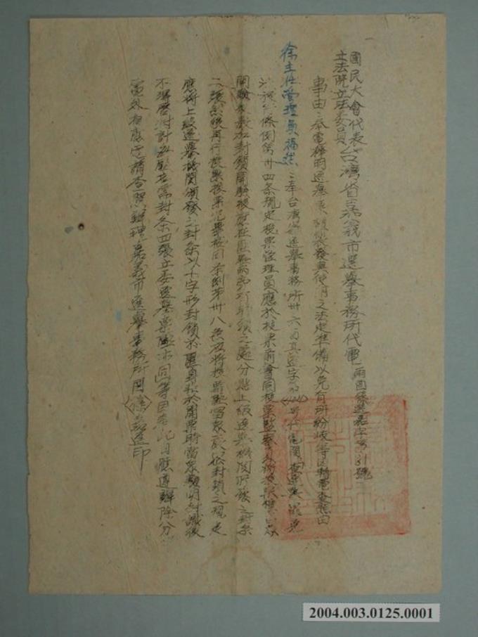 國民大會代表暨立法院立法委員臺灣省嘉義市選舉事務所寄送徐福然主任委員代電公文 共1封3張