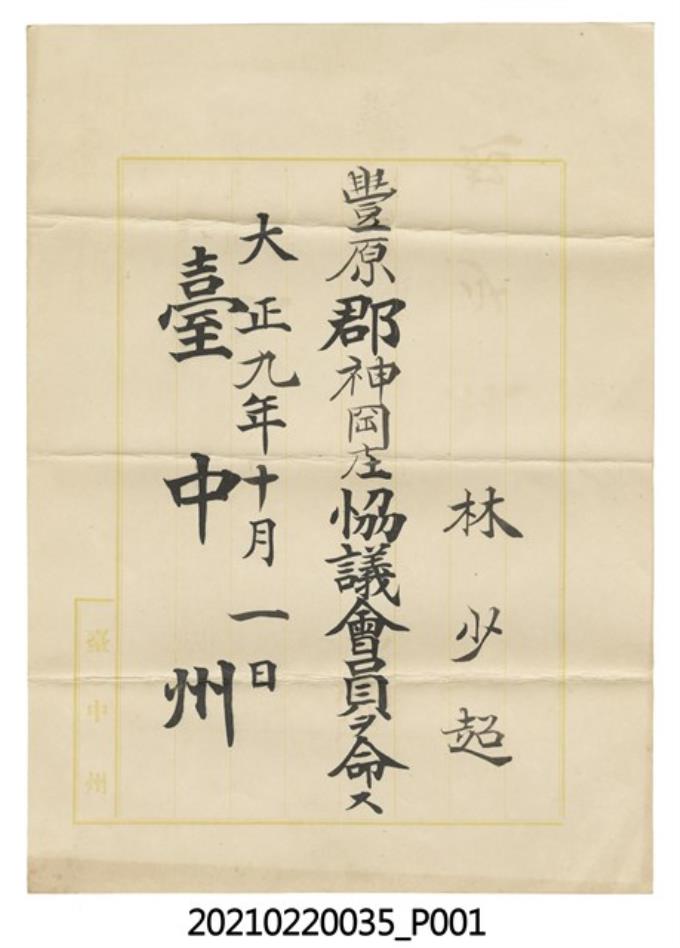 大正9年10月1日命林少超任臺中州豐原郡神岡庄協議會員紙件