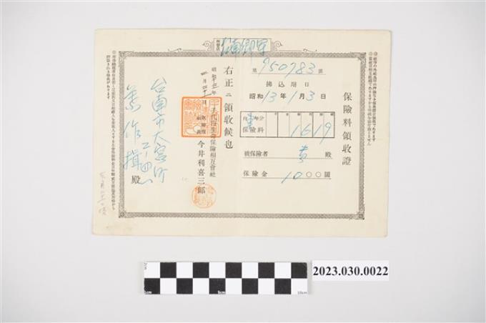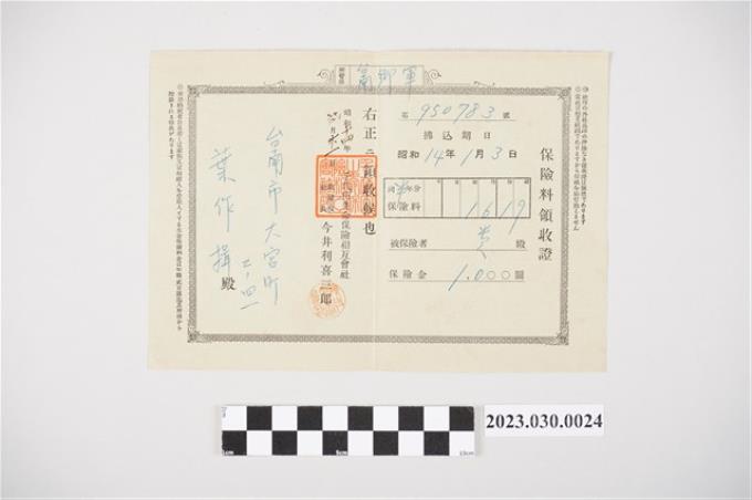 昭和15年千代田生命保險相互會社給葉作揖保險費收據