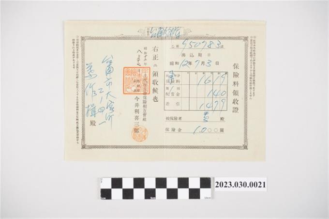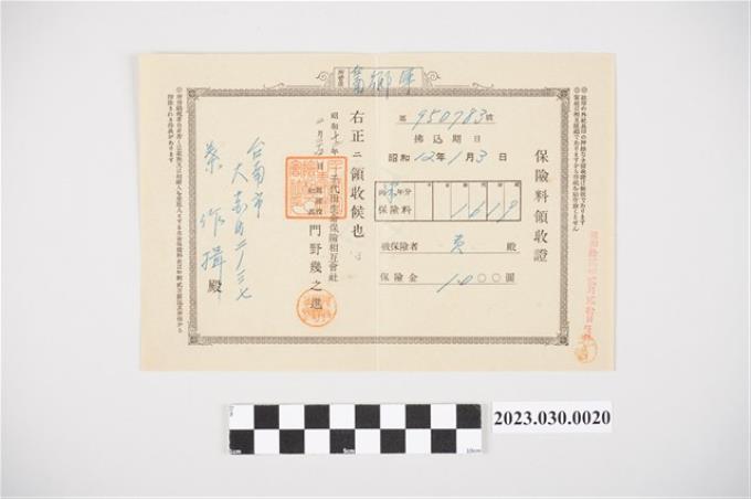 昭和12年8月27日千代田生命保險相互會社給葉作揖保險費收據