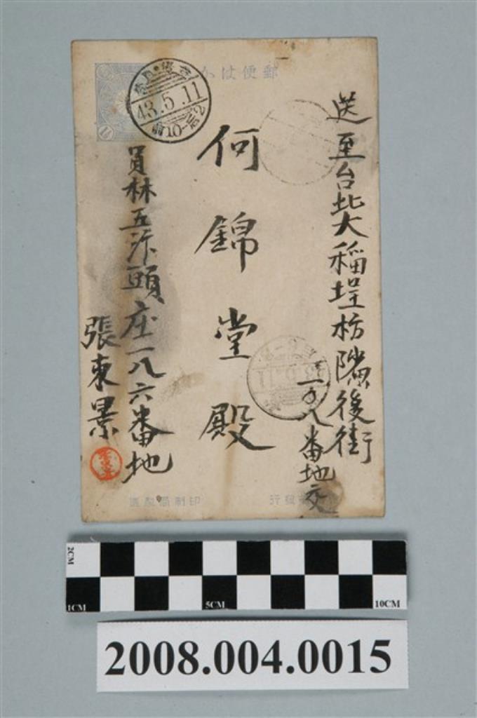 遞信省發行印刷局製造員林張東景寄臺北何錦堂