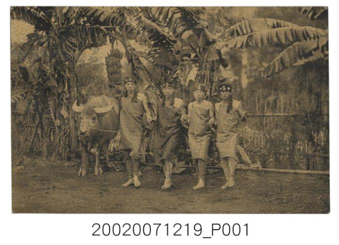 四名穿原住民服飾的男生及一位牽水牛的孩童擺出傳統舞姿