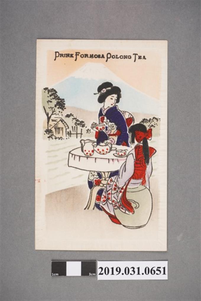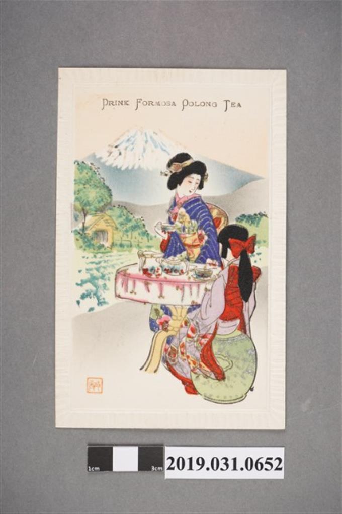 和服女子喝臺灣茶圖樣,絲綢明信片