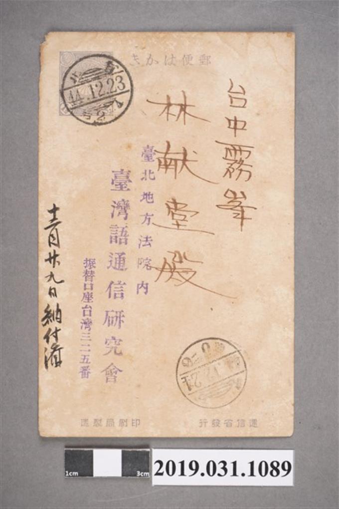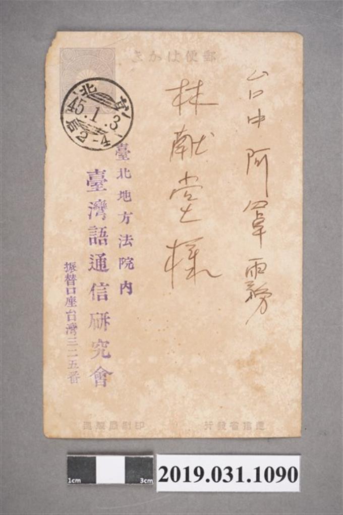 林獻堂臺灣語通信研究會寄出明信片