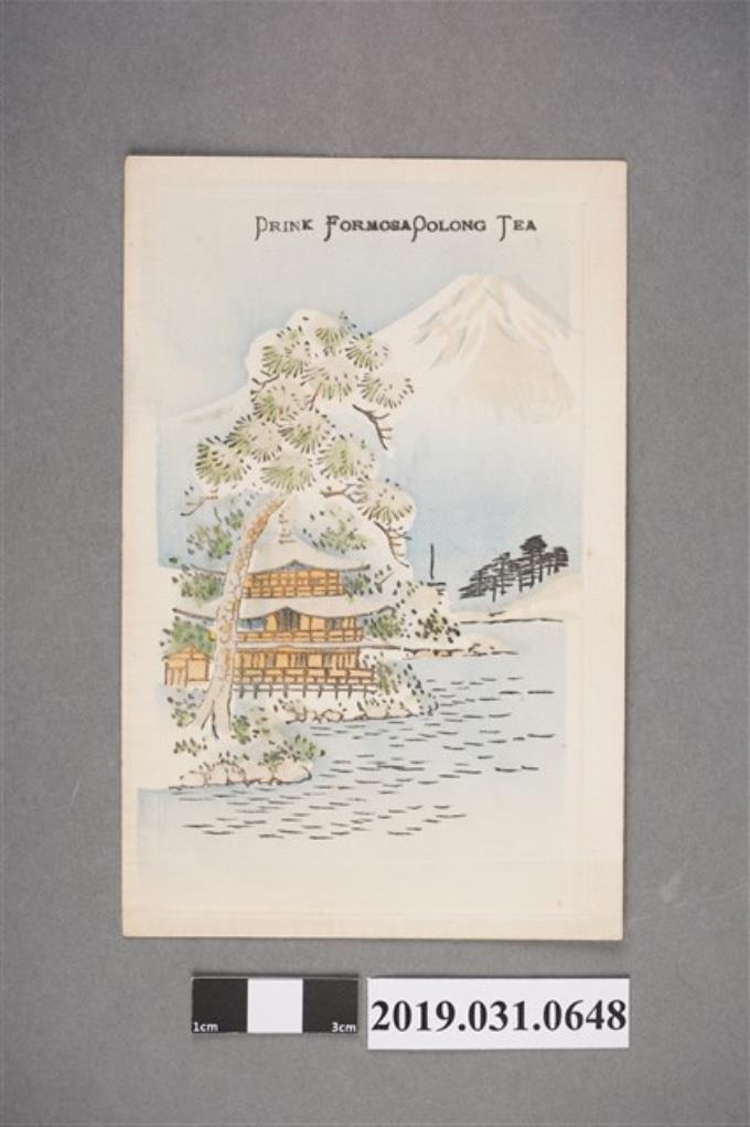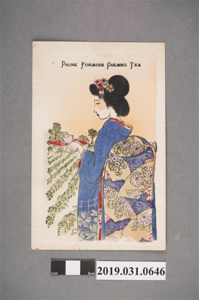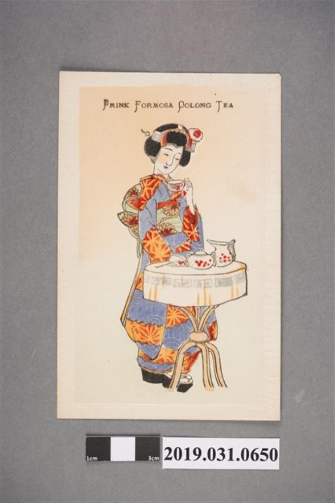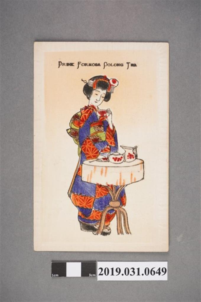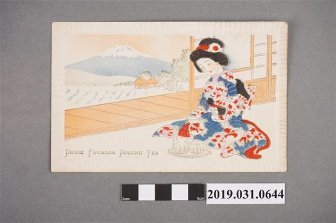 和服女子喝臺灣茶圖樣,絲綢明信片
