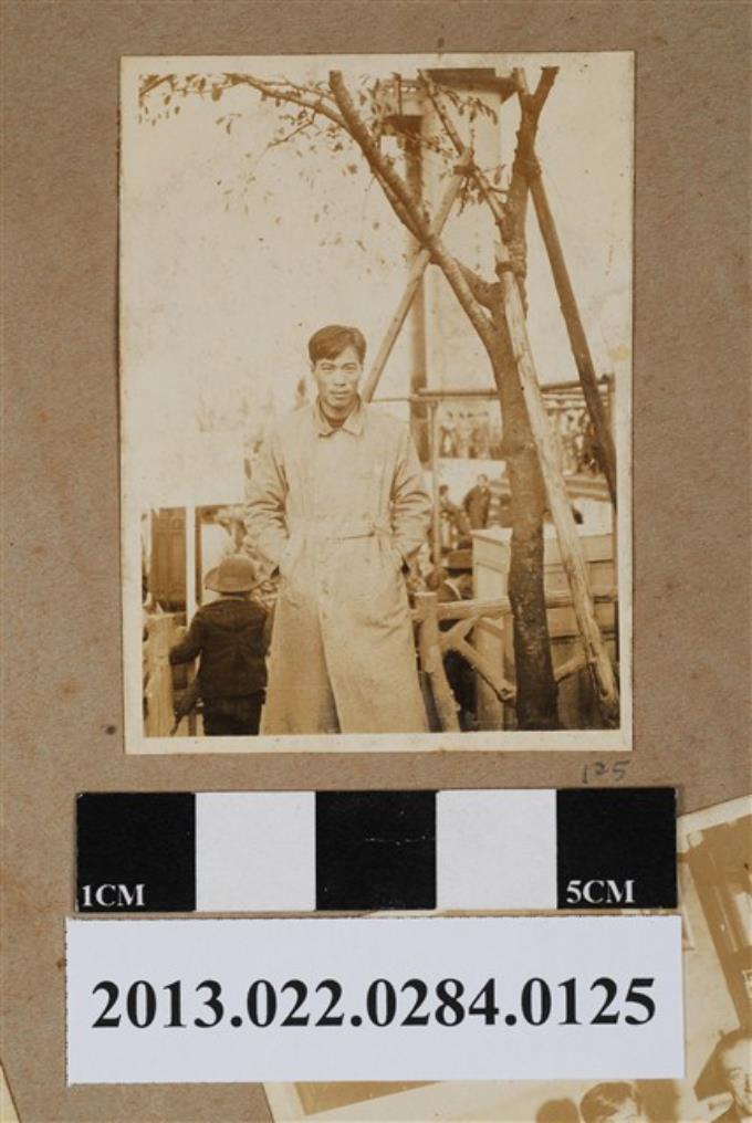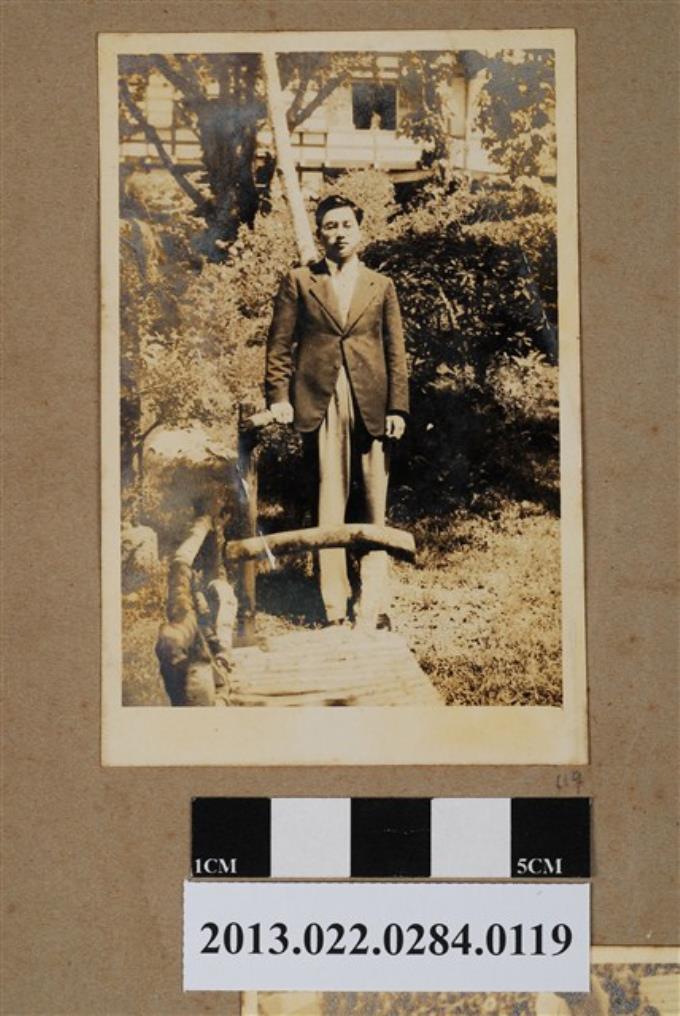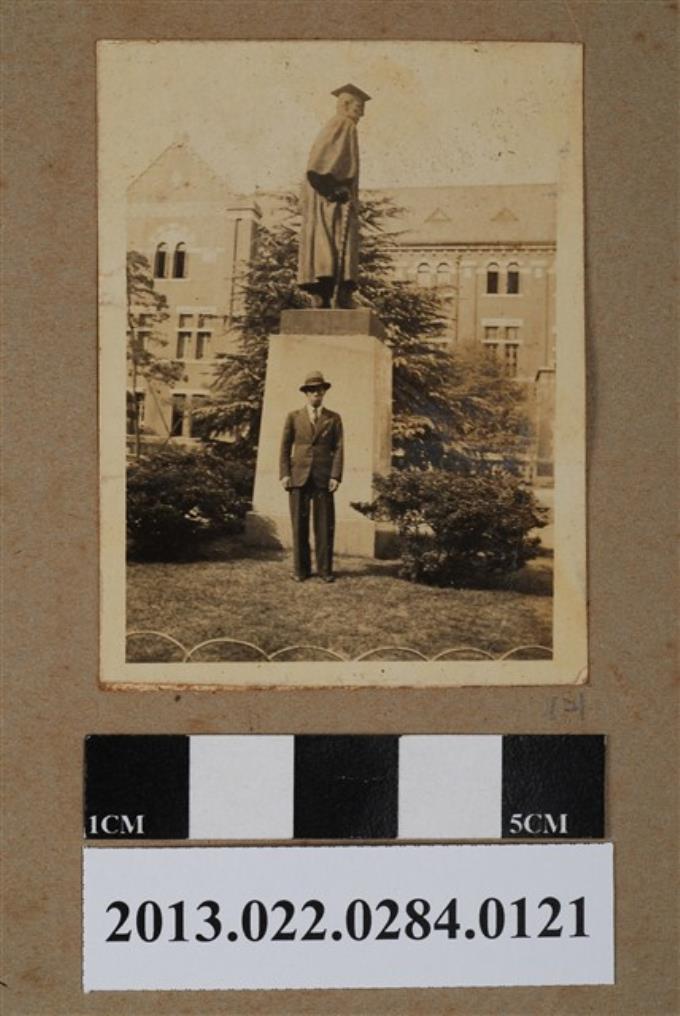 張星賢於早稻田大隈重信雕像旁獨照