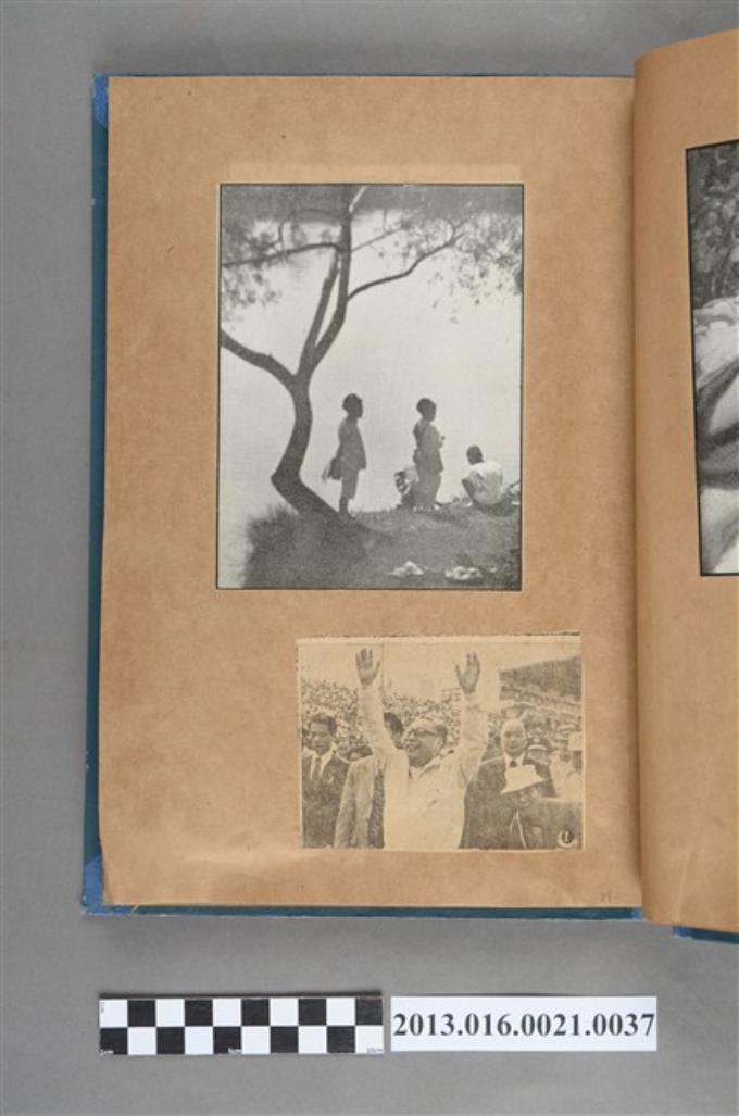 湖邊孩童三人背影剪報與蔣經國於人群雙手高舉剪報2張
