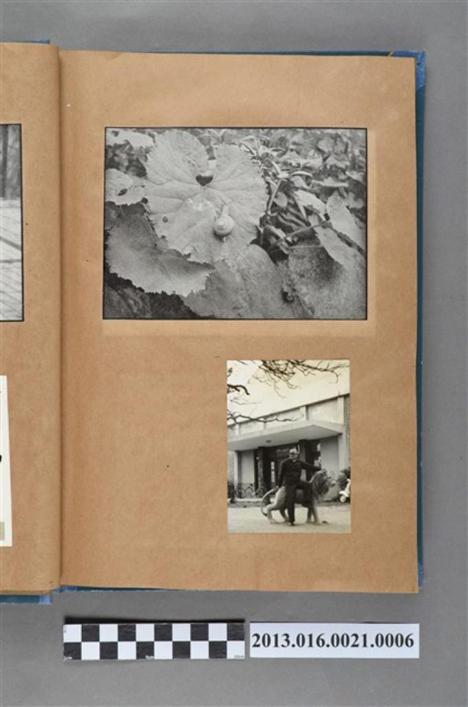 樹葉上蝸牛剪報與陳崧波靠獅子雕塑剪影照2張