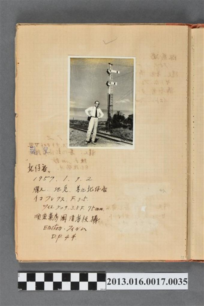 民國47年1月7日善化北仔店臂木式鐵路號誌機前陳崧波獨照