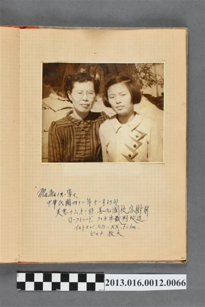 民國42年11月陳崧波妻子與女兒於善化國校榕樹前合照1張
