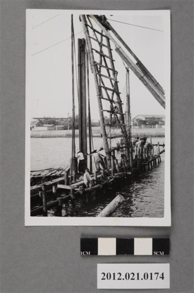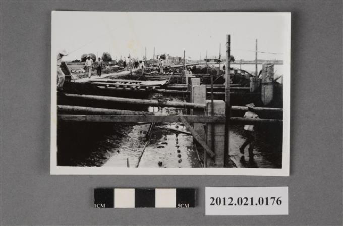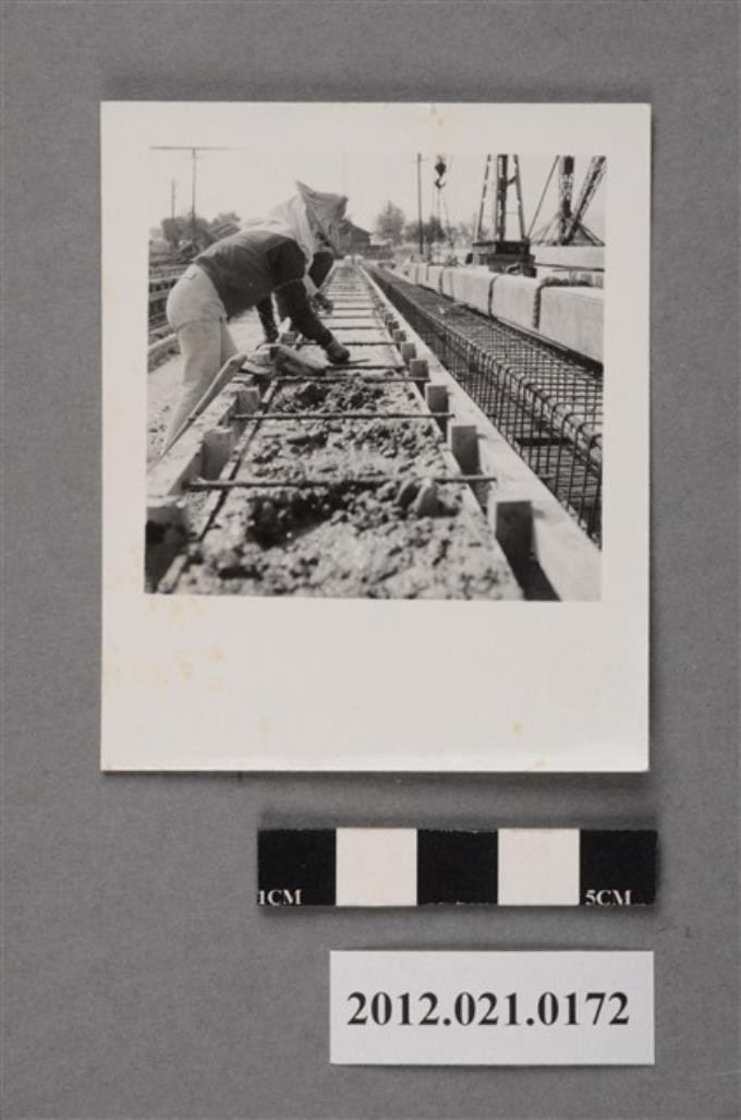 基地內工程戴斗笠工人彎腰施工黑白照片