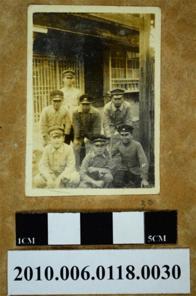 七位男子於建築物前合影之照片