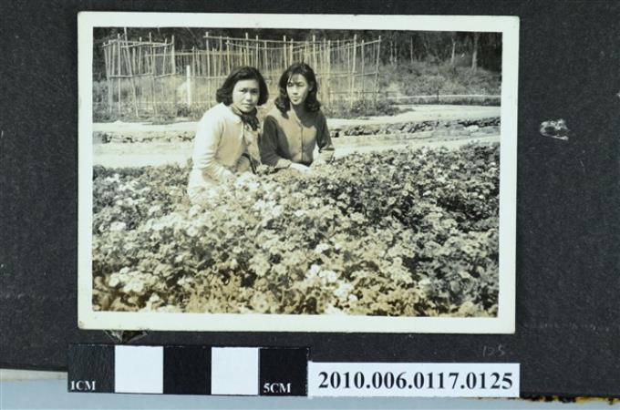 兩位女子蹲於花叢合影之照片