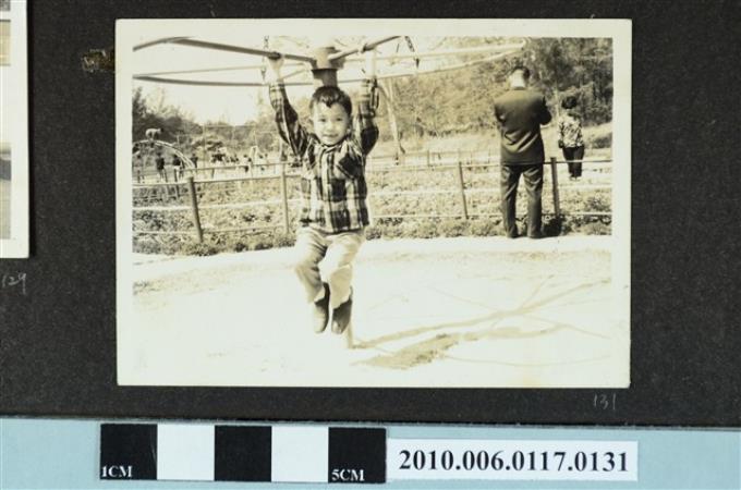 穿著格紋襯衫男童玩遊樂設施之照片