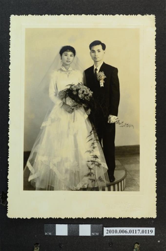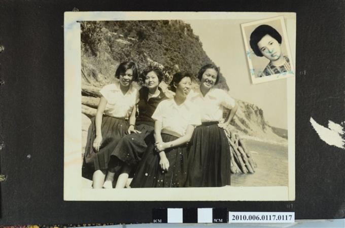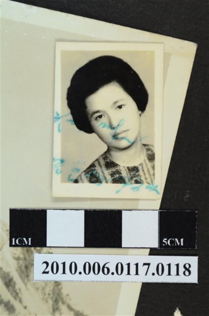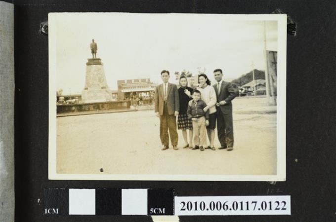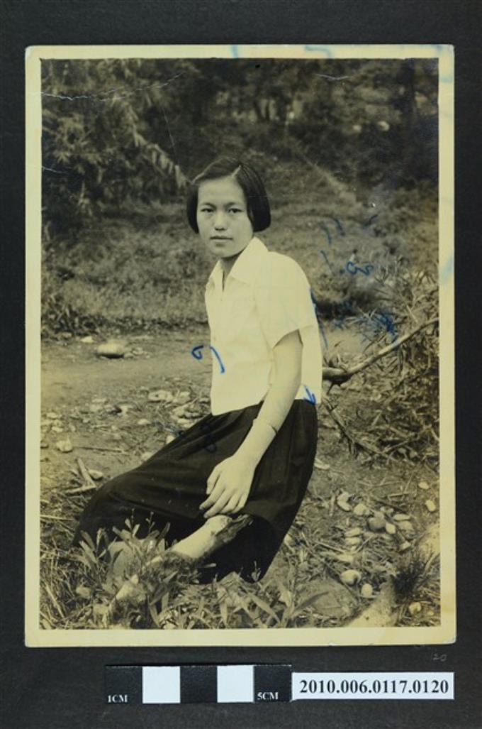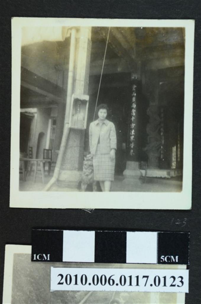 一女子站立於觀音佛寺大殿前石獅旁獨影之照片