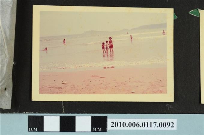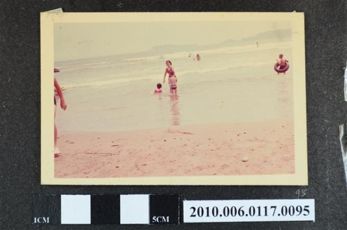 一女子與2位孩童在海邊戲水的照片