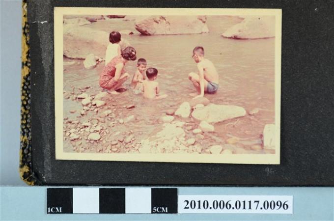 一女子與四位孩童在河邊戲水的照片
