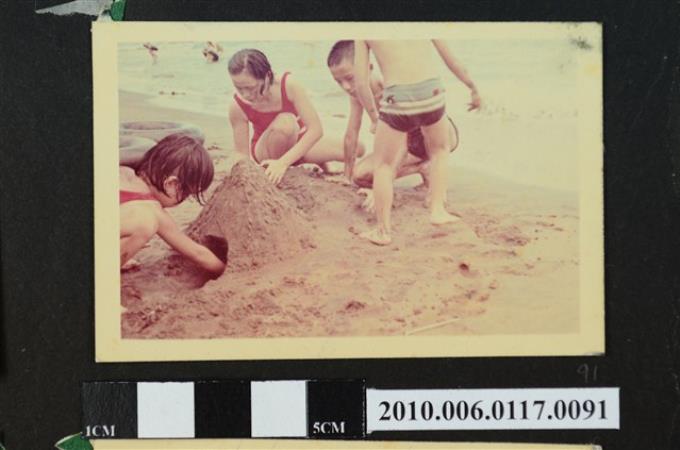 一女子與3位孩童在沙灘堆沙堆的照片