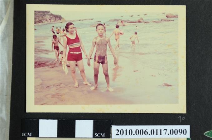 一男孩與一女子在海岸邊遊玩的照片