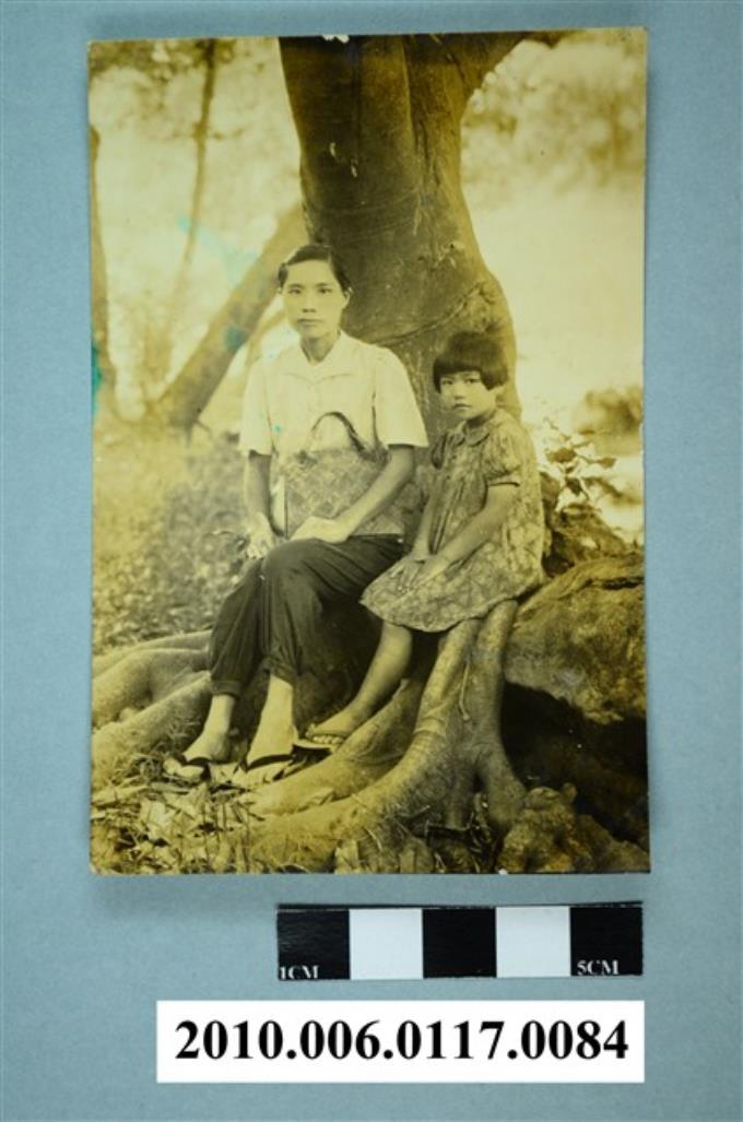 一女子與一女童坐在樹下凸出地面樹根合影之照片