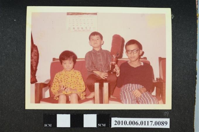 三位孩童坐於椅上合影之照片