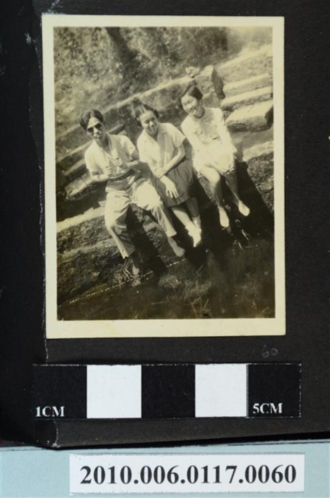 三人坐於溪水旁矮階合影之照片
