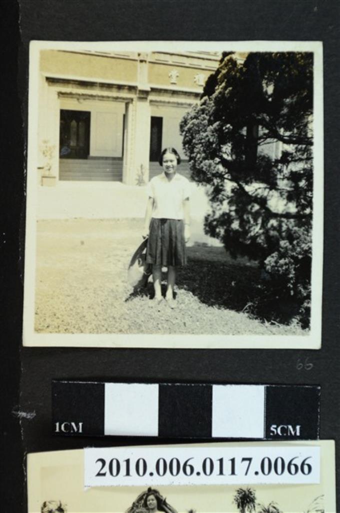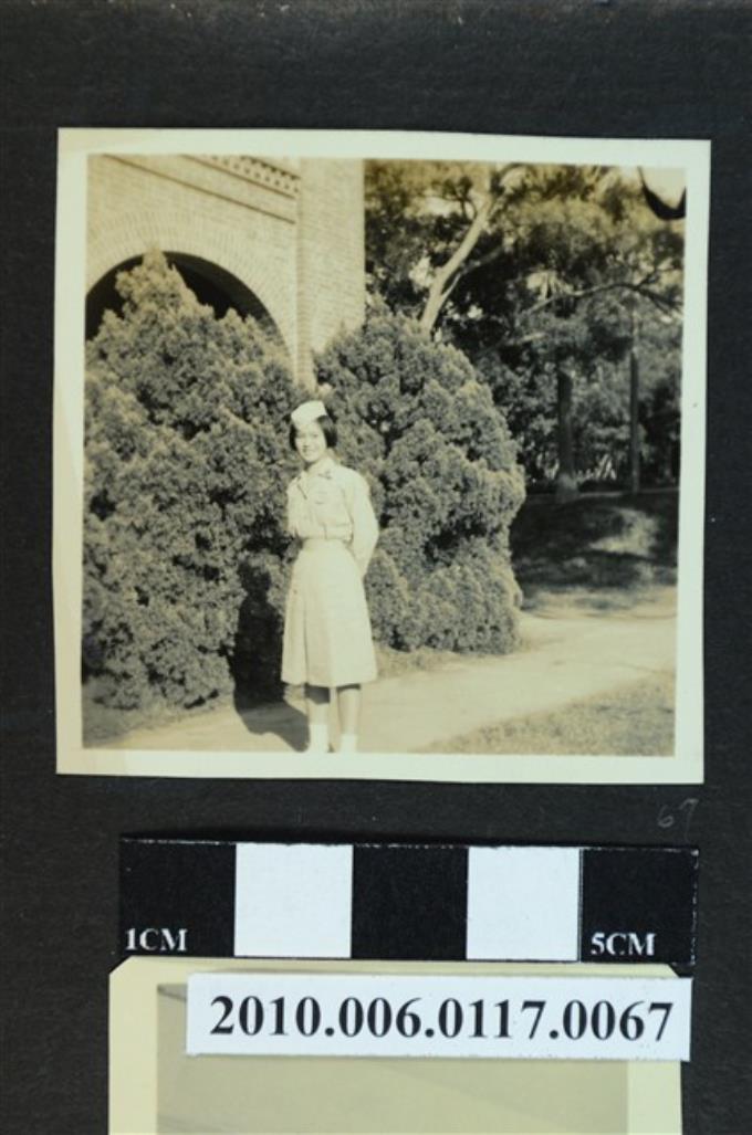 一女子在禮堂外樹叢旁獨影之照片