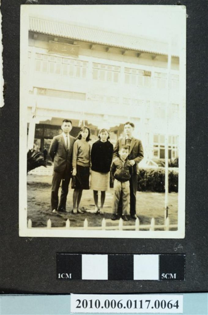 五人於臺中教師會館養正樓前合影之照片