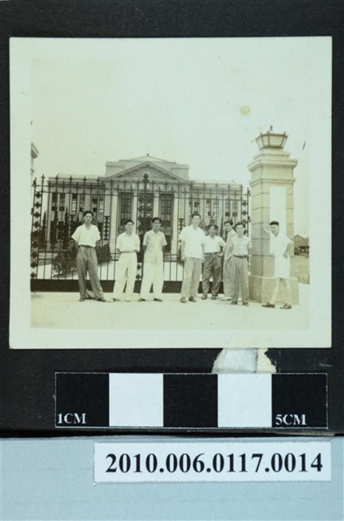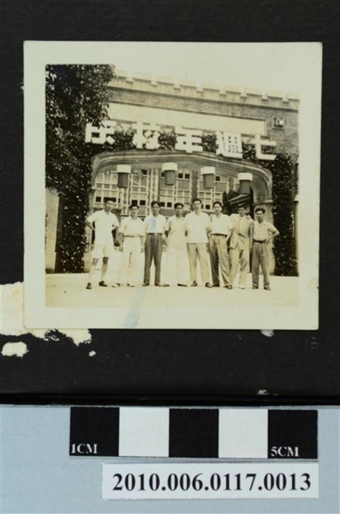 八位男子於臺灣省立師範學院七週年校慶校門前合影之照片