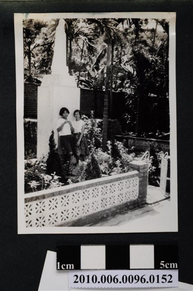 二位女子依靠在聖母像基座合影之照片