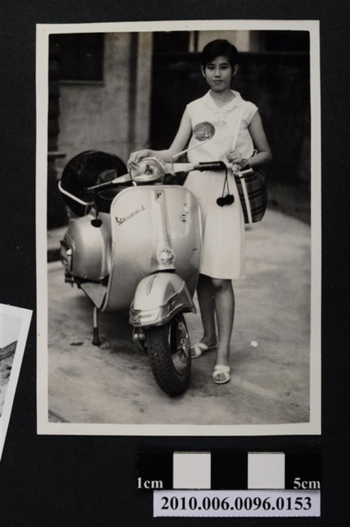 身穿有領無袖連身洋裝女子與偉士牌摩托車合影之照片