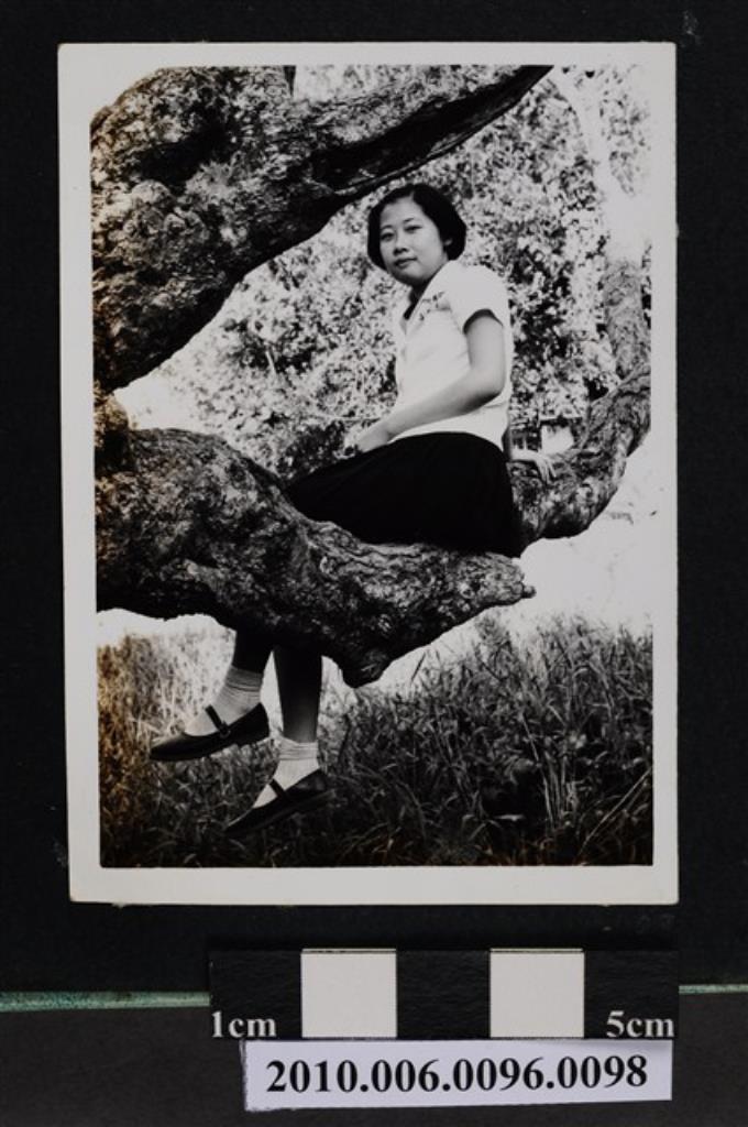 一女子坐於矮樹叢旁獨影之照片