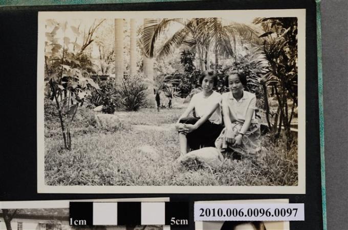 二位女子坐於草皮中石頭上合影之照片