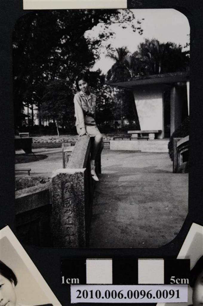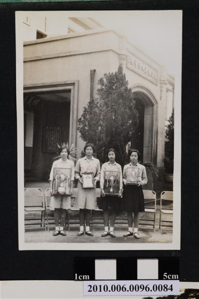 四位女孩手捧獎盃及獎牌站立於省立屏東女子中學建築物前合影之照片