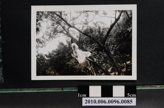 一女子坐於樹幹間獨影之照片