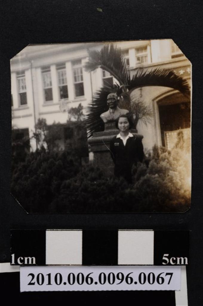 身穿制服的女子於省立屏東女子中學國父造像前獨影之照片