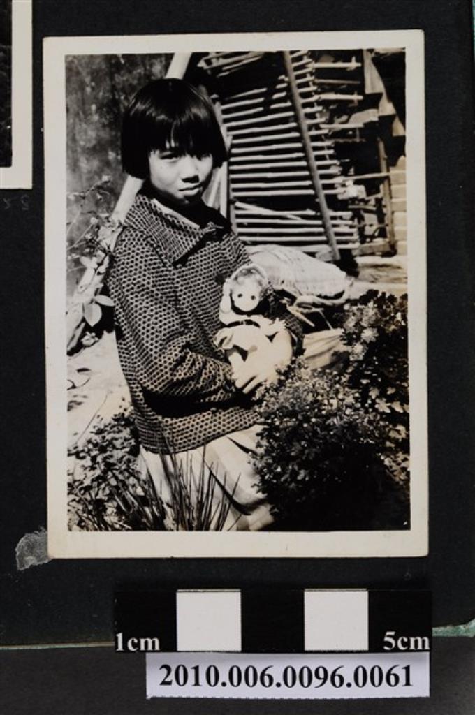 一女孩抱著洋娃娃站立於矮樹叢間獨影之照片