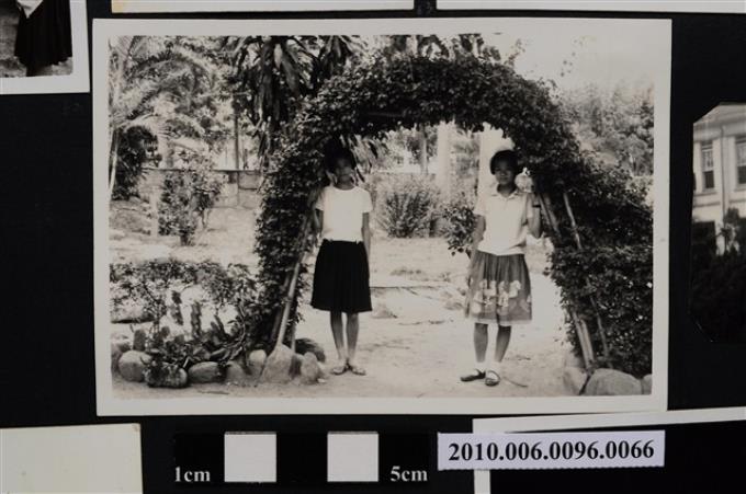 二位女子站立於拱門造型植栽下合影之照片