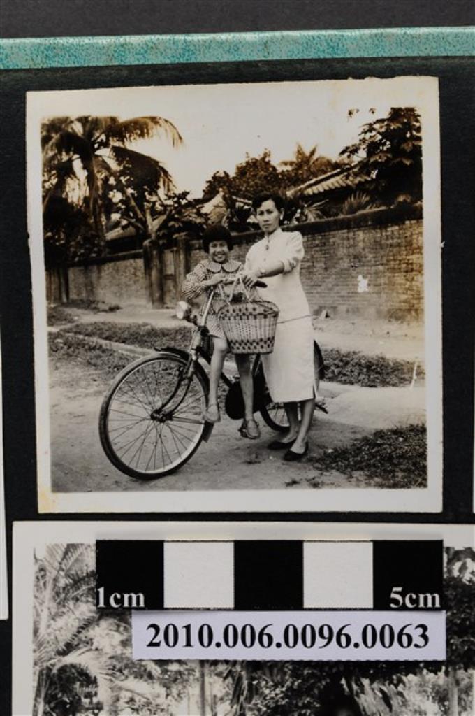 一婦人牽著一臺坐有女童的腳踏車合影之照片