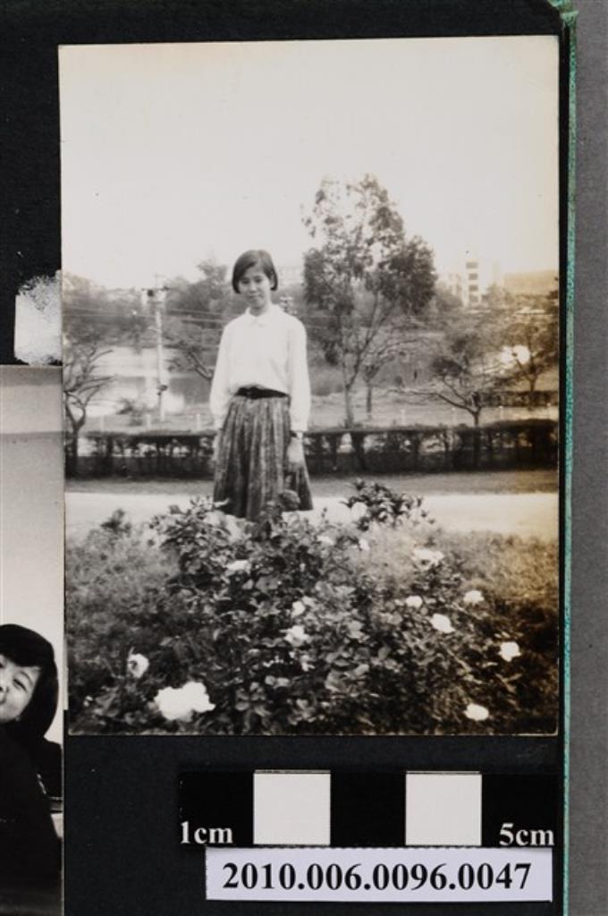 一女子站立於花叢後方獨影之照片